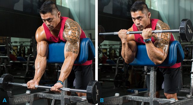 Con los brazos apoyados firmemente contra el acolchado, levanta la mancuerna o la barra EZ sin balancearla ni utilizar la inercia; eso mantiene la tensión sobre el músculo.