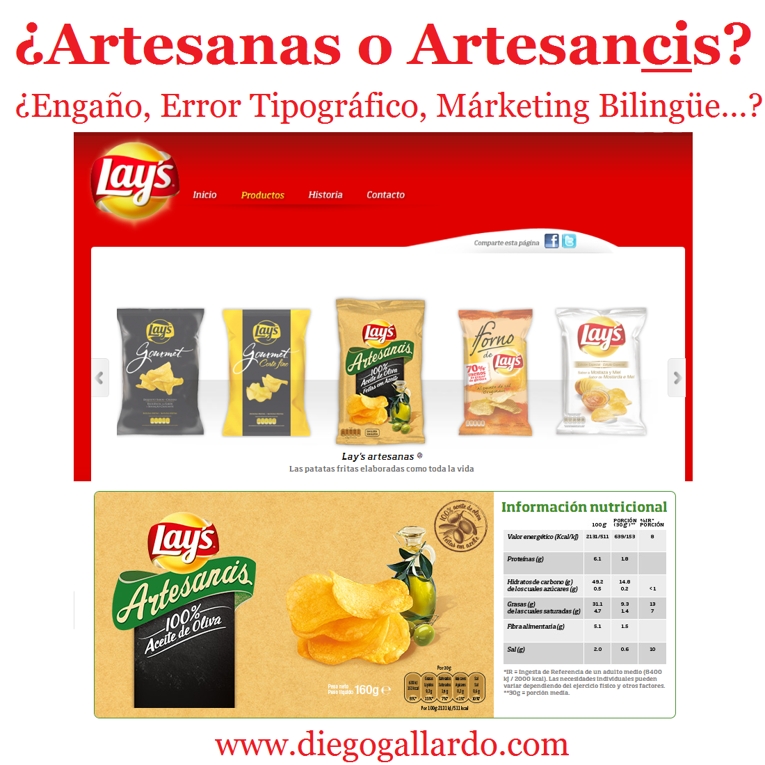 Resulta curiosa esta controversia sobre las Patatas Lays, ya que en su envoltorio en vez de poner “Artesanas” pone un “palabro” que resulta ser Artesancis…