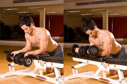 * Flexiona las muñecas, levantando las mancuernas tanto como puedas (las manos deberían llegar hasta unos 60 grados sobre la horizontal). Levántalas a velocidad moderada y mantén los codos y los antebrazos en contacto con el banco en todo momento.